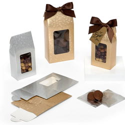 กล่องขนมลายนูนโลหะแบบหรูหราหน้าต่างตรงเคลือบผิวมันเคลือบยูวีแบบกำหนดเอง